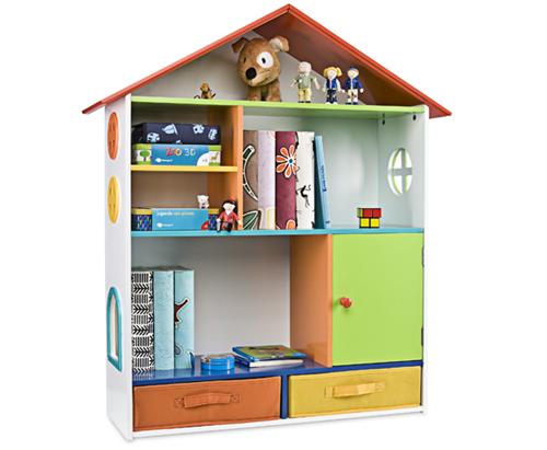 La casetta è in legno verniciato con colori allegri ed è perfetta per la camera dei maschietti e delle femminucce che potranno personalizzarla con sticker e figurine. Lo scaffale, come vedete dalle immagini, è strutturato riproducendo la forma di una casetta divisa in più piani e di dimensioni diverse in modo da poter riempire gli spazi vuoti con gli oggetti più adatti. La casetta ospita un tetto spiovente e alcuni ornamenti a forma di finestra: la casetta mostra due grandi spazi utili a riporre gli oggetti più grandi, due di dimensioni medie, una porta, due cassetti di stoffa che, grazie al poliestere, sono molto facili da pulire con un panno umidificato con un po’ di semplice acqua. Le misure dei ripiani più grandi sono 49x25x28cm e 33x29x28cm, le dimensioni dei pannelli medie sono 25×14 x28cm.