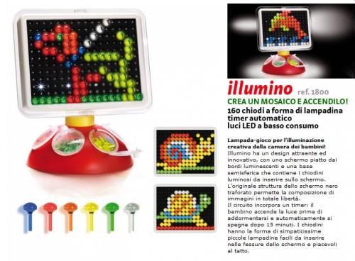 Illumino è una lampada gioco dalla doppia funzione perché di giorno terrà compagnia a tutti i bambini offrendo loro la possibilità di creare forme e disegni con i chiodini colorati, mentre la notte terrà loro compagnia illuminandosi e cullando i piccoli durante i loro sogni. La lampada gioco ha un design molto innovativo che dà un tocco di modernità a uno dei giochi più amati dai piccoli e che ha fatto divertire generazioni di piccoli creativi. La lavagnetta è dotata di schermo piatto e bordi luminescenti, il tutto posato su una base semisferica dove sono contenuti i chiodini che potranno essere infilati nelle fessure della lavagna che si presenta a sfondo nero invece del solito bianco candido.