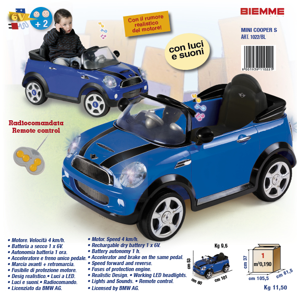 I modelli che vi presentiamo oggi sono due, uno ispirato alla Mini, una macchina da città apprezzatissima da molti automobilisti per la linea giovane e scattante ma al tempo stesso molto chic, e il modello Fuoristrada, l’automobile adatta a ogni tipo di terreno sempre più presente sulle strade italiane e compagna preferita di mille gite fuori porta e ispirato al Tuareg e adattato alle linee concrete del Made in Italy. Il modello Mini, più adatto alle bambine che potranno giocare con le amichette fingendo di fare shopping nelle vie più esclusive ed eleganti del centro, viene offerto in numerosi colori, tra cui il rosso, il blu e il rosa; il Fuoristrada invece, dalla linea più sportiva e dai colori ispirati alla natura, è disponibile nei toni del verde fluorescente e grigio metallizzato.