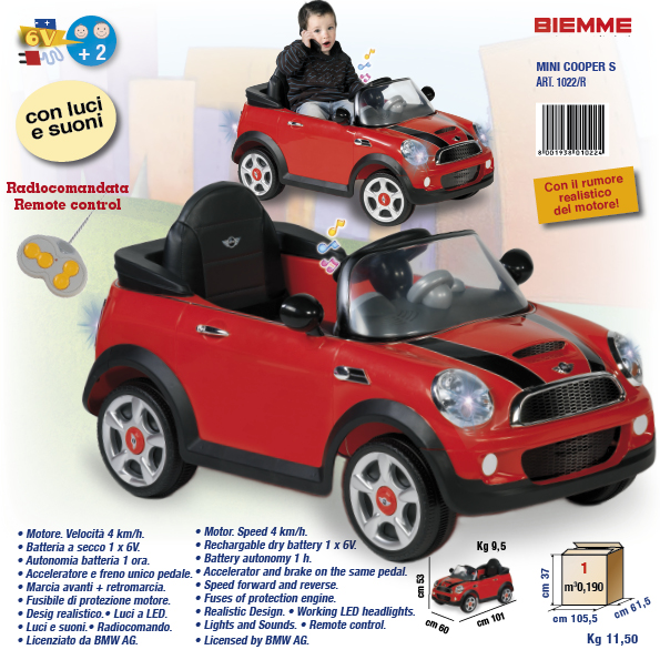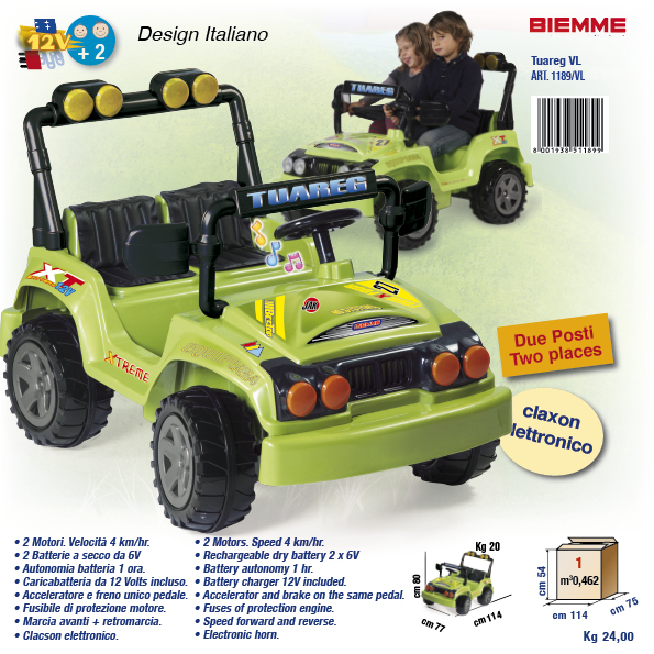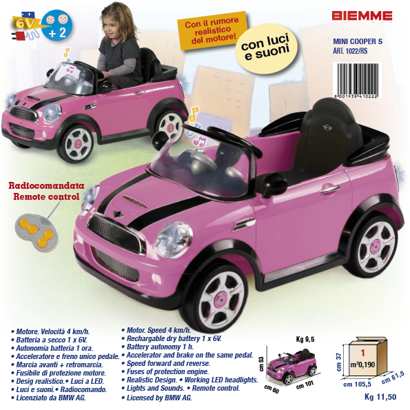 I modelli che vi presentiamo oggi sono due, uno ispirato alla Mini, una macchina da città apprezzatissima da molti automobilisti per la linea giovane e scattante ma al tempo stesso molto chic, e il modello Fuoristrada, l’automobile adatta a ogni tipo di terreno sempre più presente sulle strade italiane e compagna preferita di mille gite fuori porta e ispirato al Tuareg e adattato alle linee concrete del Made in Italy. Il modello Mini, più adatto alle bambine che potranno giocare con le amichette fingendo di fare shopping nelle vie più esclusive ed eleganti del centro, viene offerto in numerosi colori, tra cui il rosso, il blu e il rosa; il Fuoristrada invece, dalla linea più sportiva e dai colori ispirati alla natura, è disponibile nei toni del verde fluorescente e grigio metallizzato.