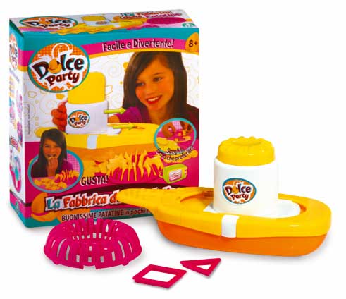 La fabbrica delle patatine è un giocattolo per tutti i bambini e le bambine che vogliano aiutare la mamma ad affettare le patatine per la cena o per una merenda diversa dal solito. La fabbrica delle patatine si presenta come una macchinetta colorata a forma di nave che al suo interno nasconde molte formine per tagliare le patate: una a triangolo, una a quadrato e la classica per affettare le patate a forma ovale.